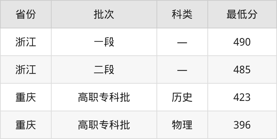 江西司法警官职业学院行政管理专业在全国各省最低录取分数线为396分(重庆物理类),除此之外,在其余地区的最低分为浙江485分,以上数据均为2025年数据,供2026年高考生参考。