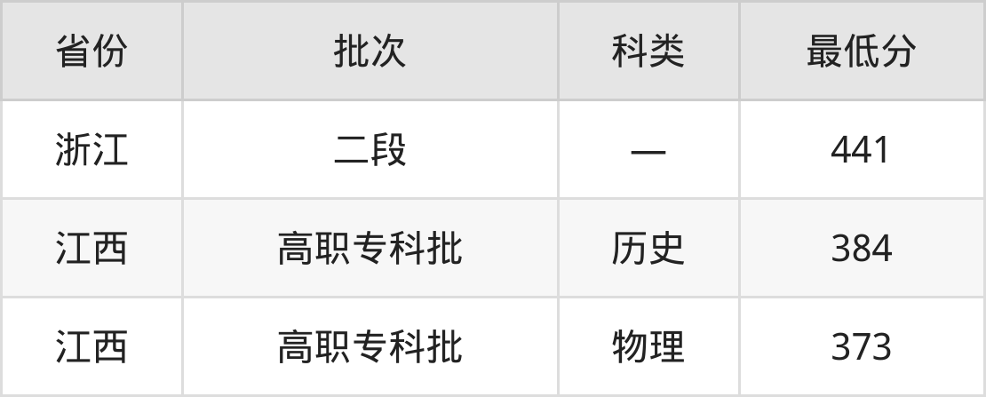 江西制造职业技术学院大数据与会计专业录取分数线从373分到441分不等,最低分数线如下:
