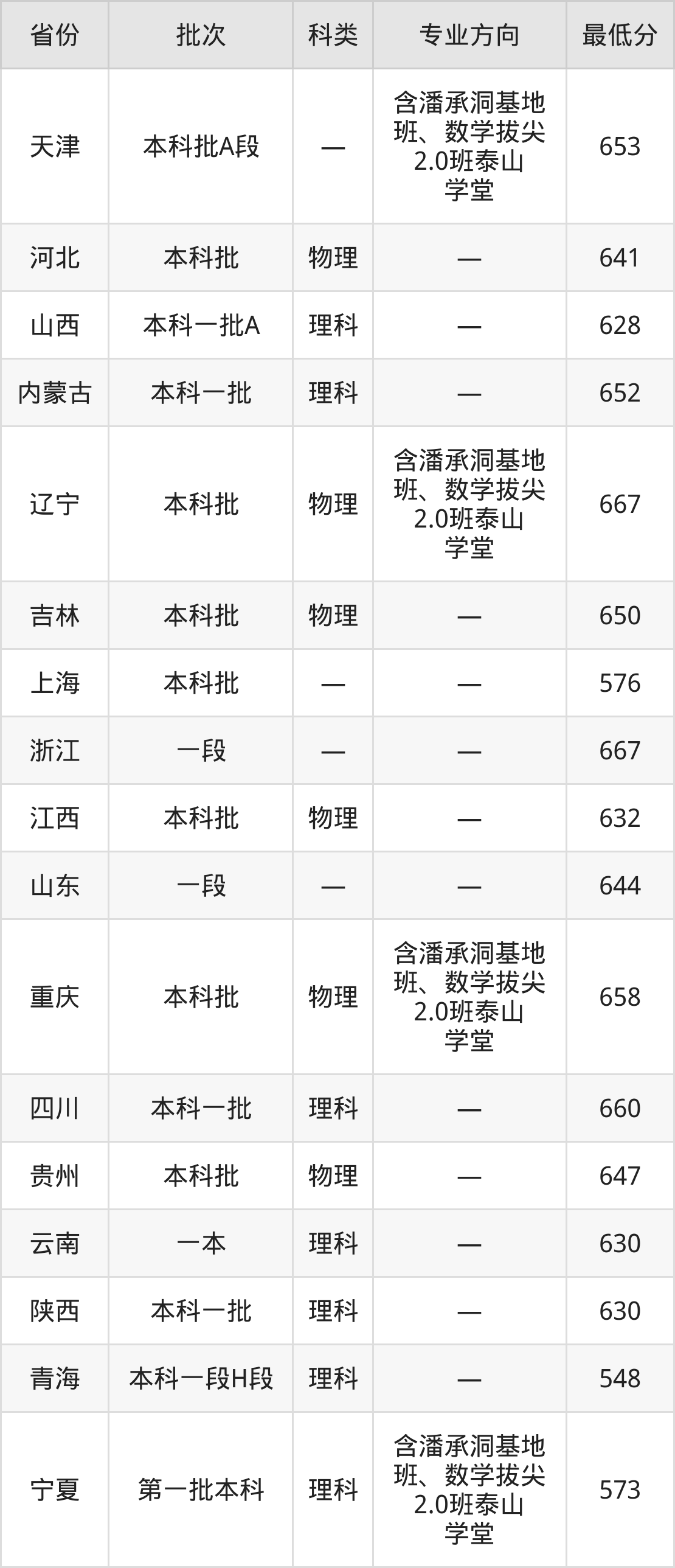 山东大学数学类专业录取分数线从548分到667分不等,在部分地区的最低分数线如下: