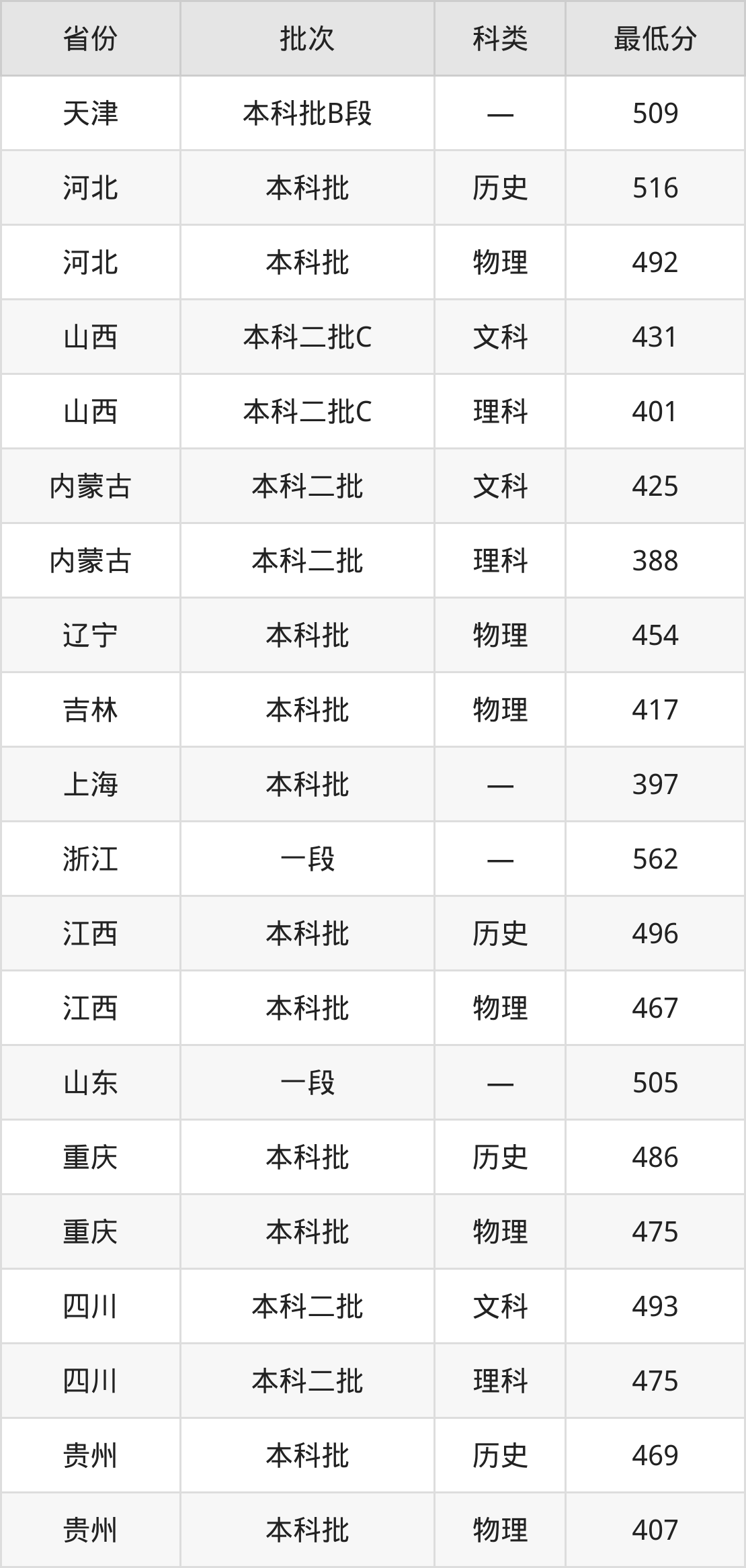 北京科技大学天津学院知识产权专业录取分数线从388分到562分不等,在部分地区的最低分数线如下: