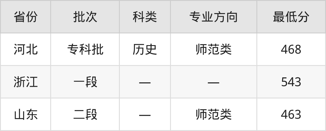 汉江师范学院小学英语教育专业录取分数线从463分到543分不等,最低分数线如下: