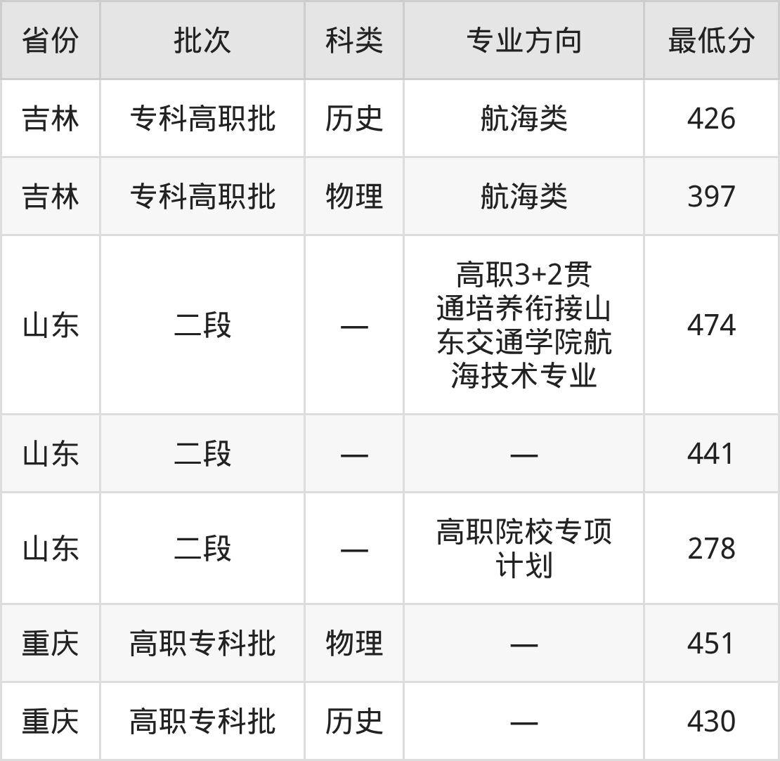 青岛港湾职业技术学院航海技术专业录取分数线从278分到474分不等,最低分数线如下: