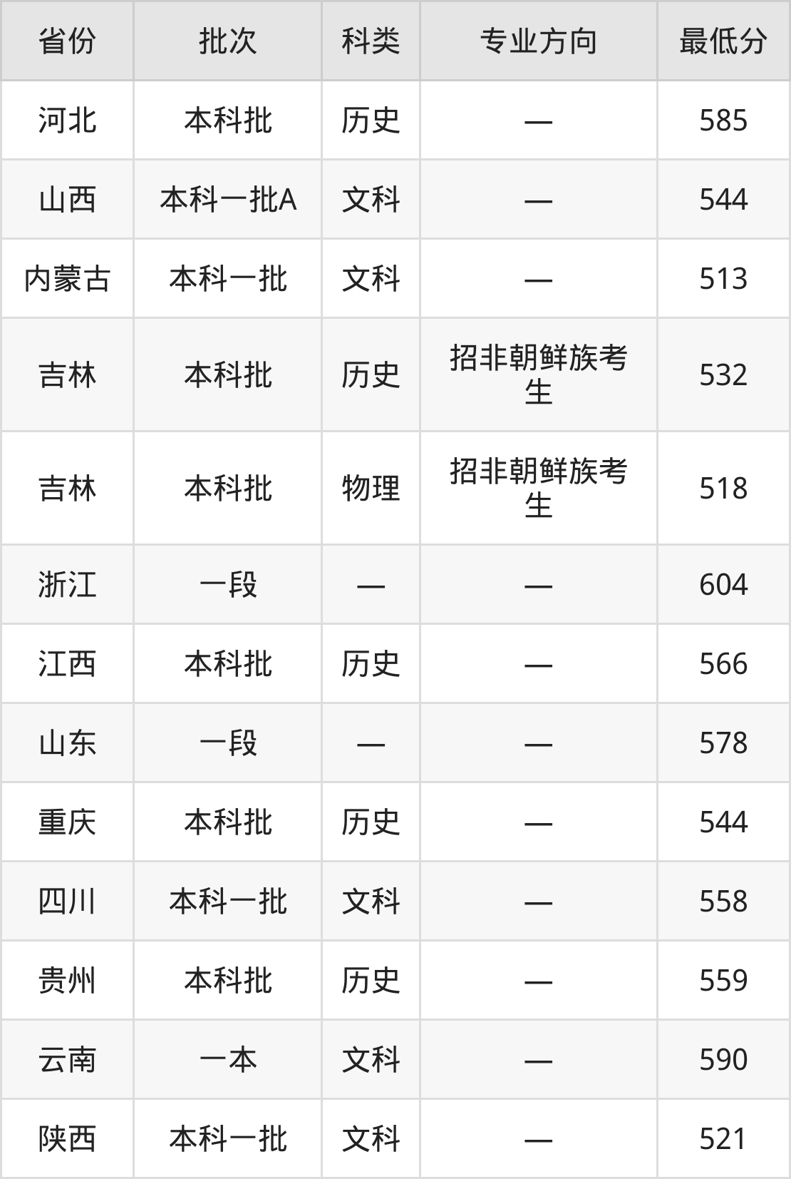 延边大学朝鲜语专业录取分数线从513分到604分不等,在部分地区的最低分数线如下: