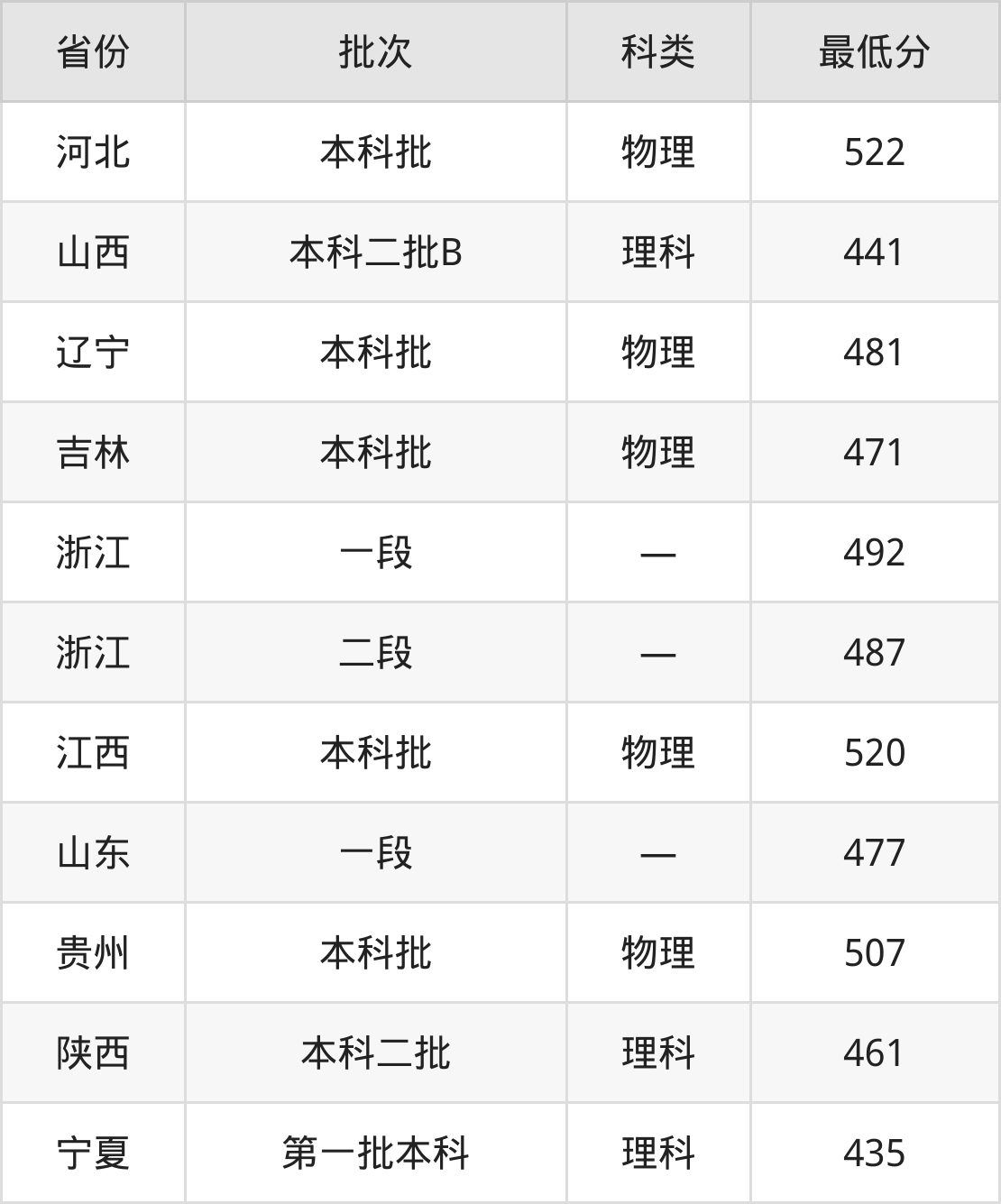 大理大学预防医学专业在全国各省最低录取分数线为435分(宁夏理科),除此之外,在其余地区的最低分为陕西理科461分、山西理科441分、吉林物理类471分、山东477分等,以上数据均为2024年数据,供2025年高考生参考。