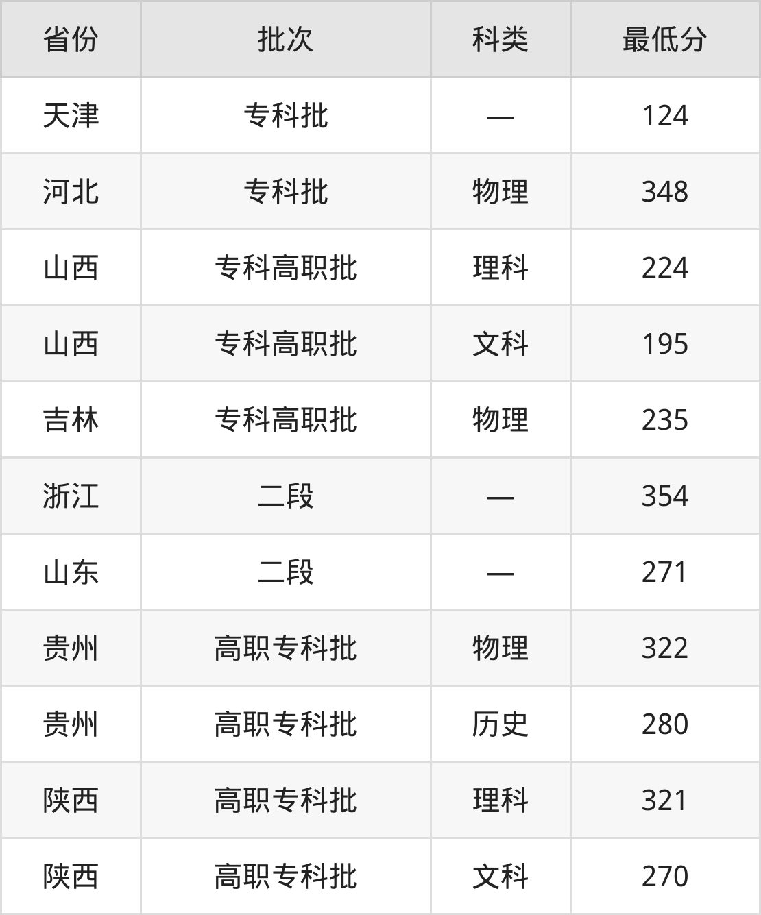山东英才学院大数据技术专业录取分数线从124分到354分不等,最低分数线如下: