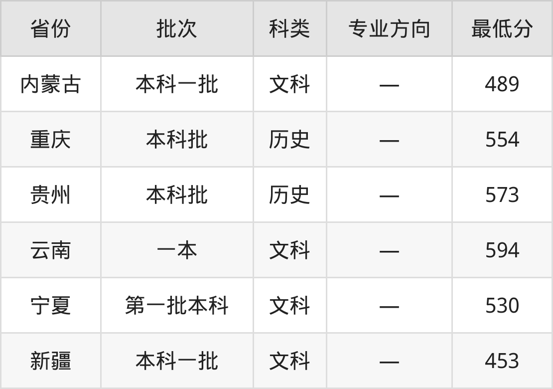 中南民族大学历史学类专业在全国各省最低录取分数线为453分(新疆文科),除此之外,在其余地区的最低分为内蒙古文科489分、重庆历史类554分、贵州历史类573分、云南文科594分等,以上数据均为2024年数据,供2025年高考生参考。
