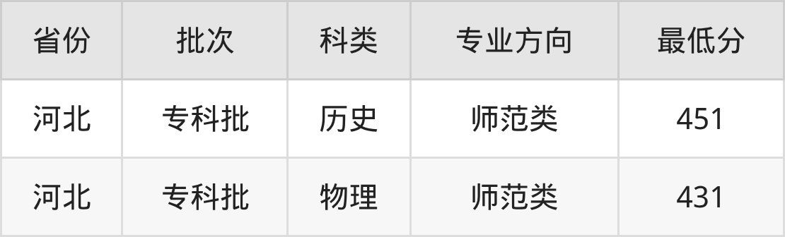保定幼儿师范高等专科学校小学英语教育专业录取分数线从431分到451分不等,最低分数线如下: