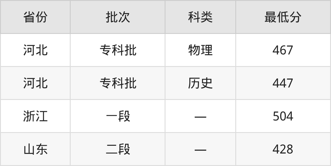 铜陵职业技术学院医学影像技术专业在全国各省最低录取分数线为428分(山东),除此之外,在其余地区的最低分为河北历史类447分、浙江504分,以上数据均为2025年数据,供2026年高考生参考。