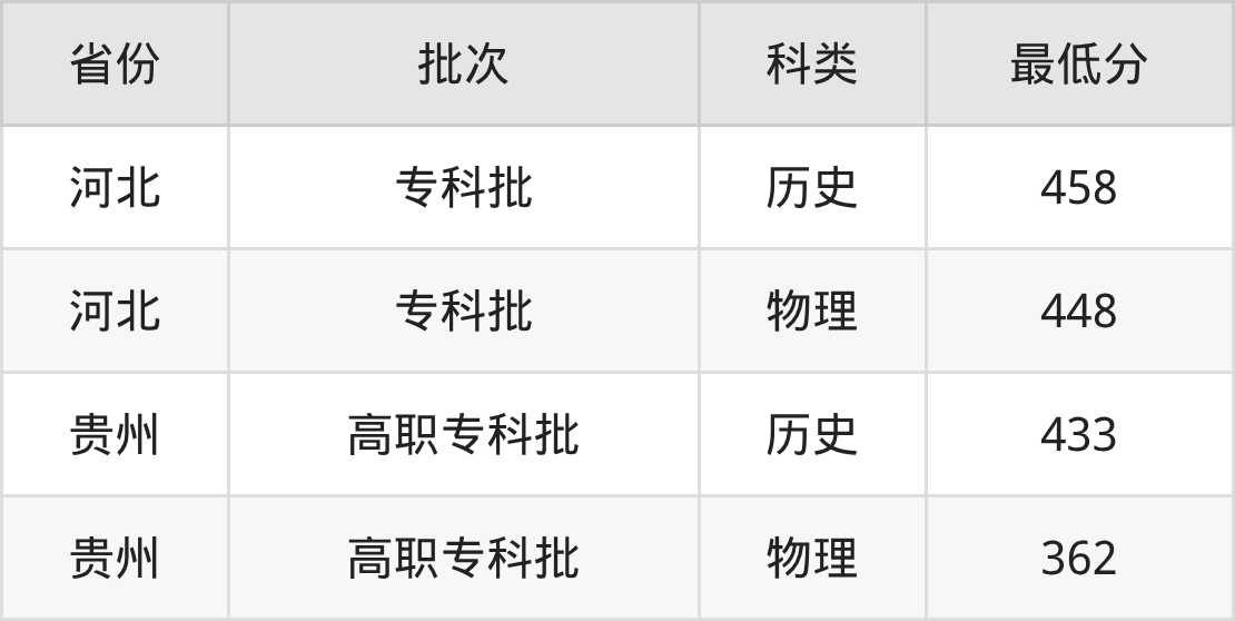 廊坊卫生职业学院中医学专业录取分数线从362分到458分不等,最低分数线如下: