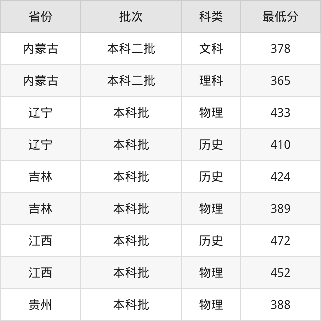 黑龙江财经学院保险学专业在全国各省最低录取分数线为365分(内蒙古理科),除此之外,在其余地区的最低分为辽宁历史类410分、吉林物理类389分、江西物理类452分、贵州物理类388分,以上数据均为2024年数据,供2025年高考生参考。