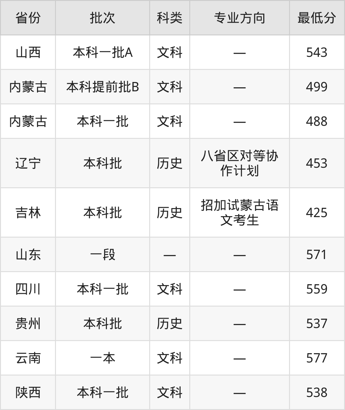 内蒙古大学旅游管理专业在全国各省录取分数线: