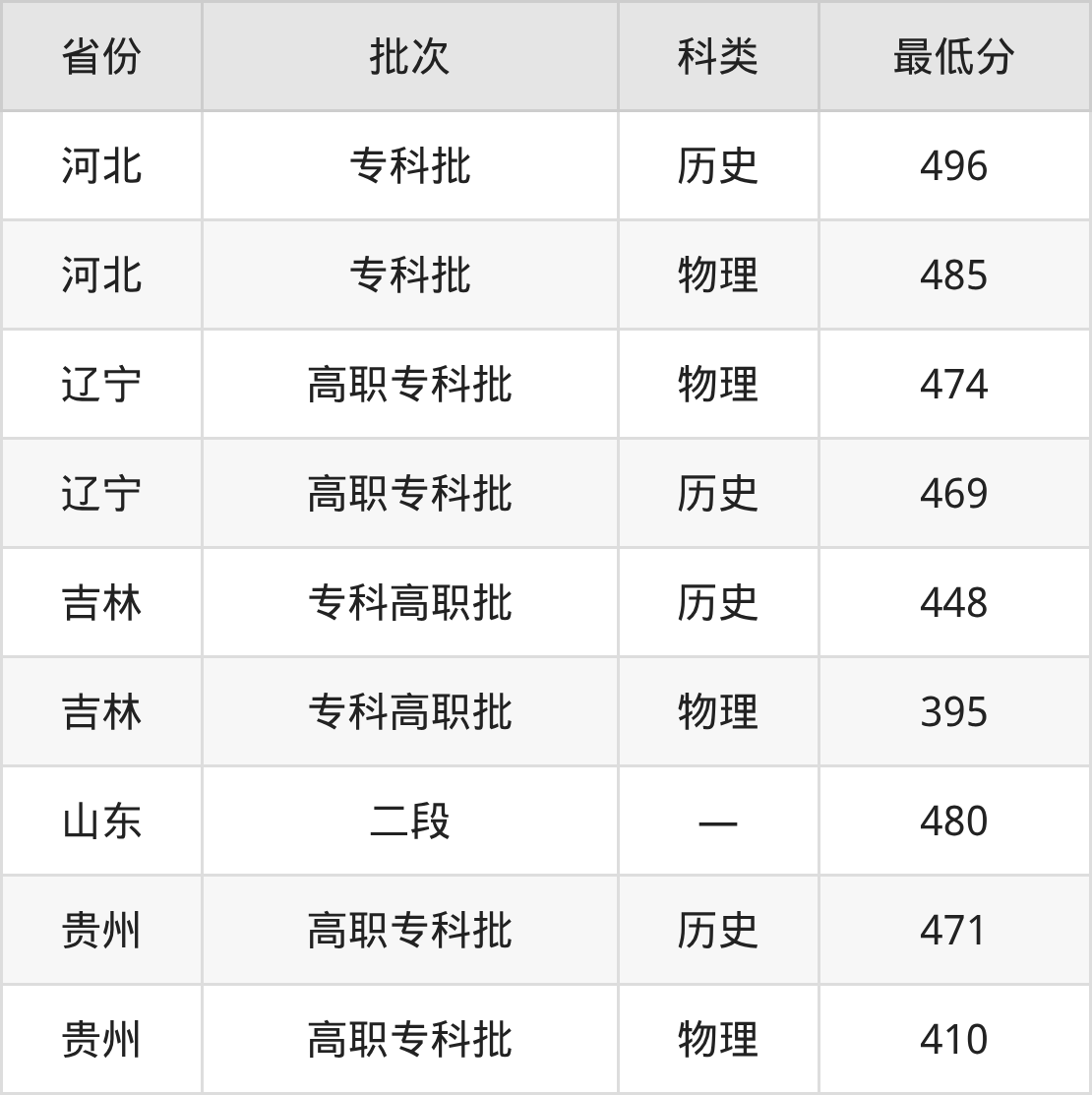 沧州医学高等专科学校口腔医学专业录取分数线从395分到496分不等,最低分数线如下: