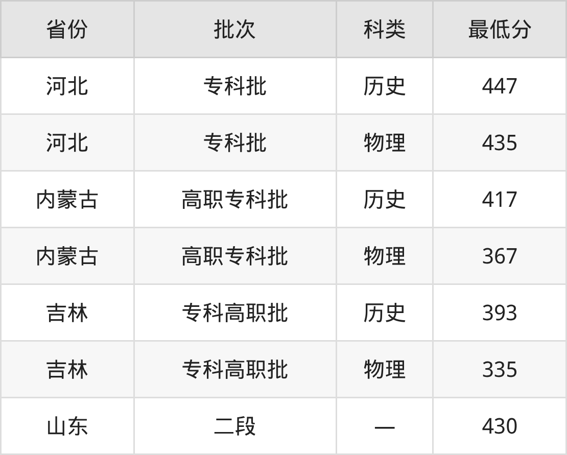 黑龙江护理高等专科学校临床医学专业录取分数线从335分到447分不等,最低分数线如下: