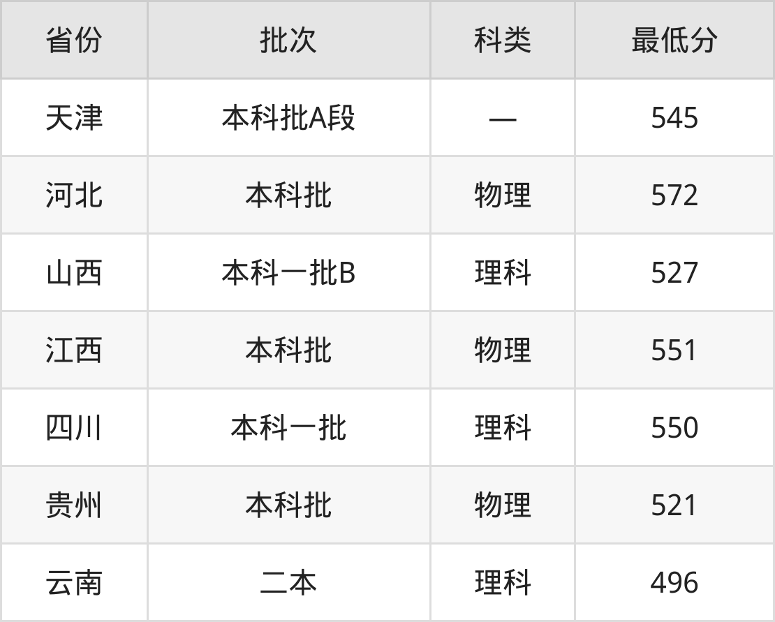 天津商业大学自动化专业在全国各省最低录取分数线为496分(云南理科),除此之外,在其余地区的最低分为天津545分、河北物理类572分、山西理科527分、江西物理类551分等,以上数据均为2024年数据,供2025年高考生参考。