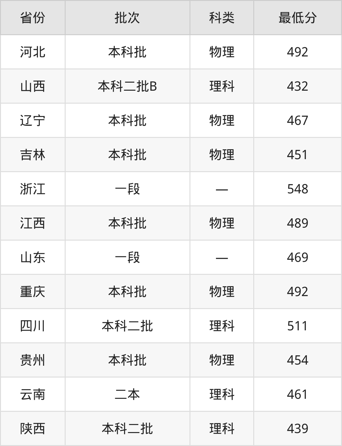 四川旅游学院烹饪与营养教育专业在全国各省最低录取分数线为432分(山西理科),除此之外,在其余地区的最低分为浙江548分、山东469分、云南理科461分、陕西理科439分等,以上数据均为2024年数据,供2025年高考生参考。