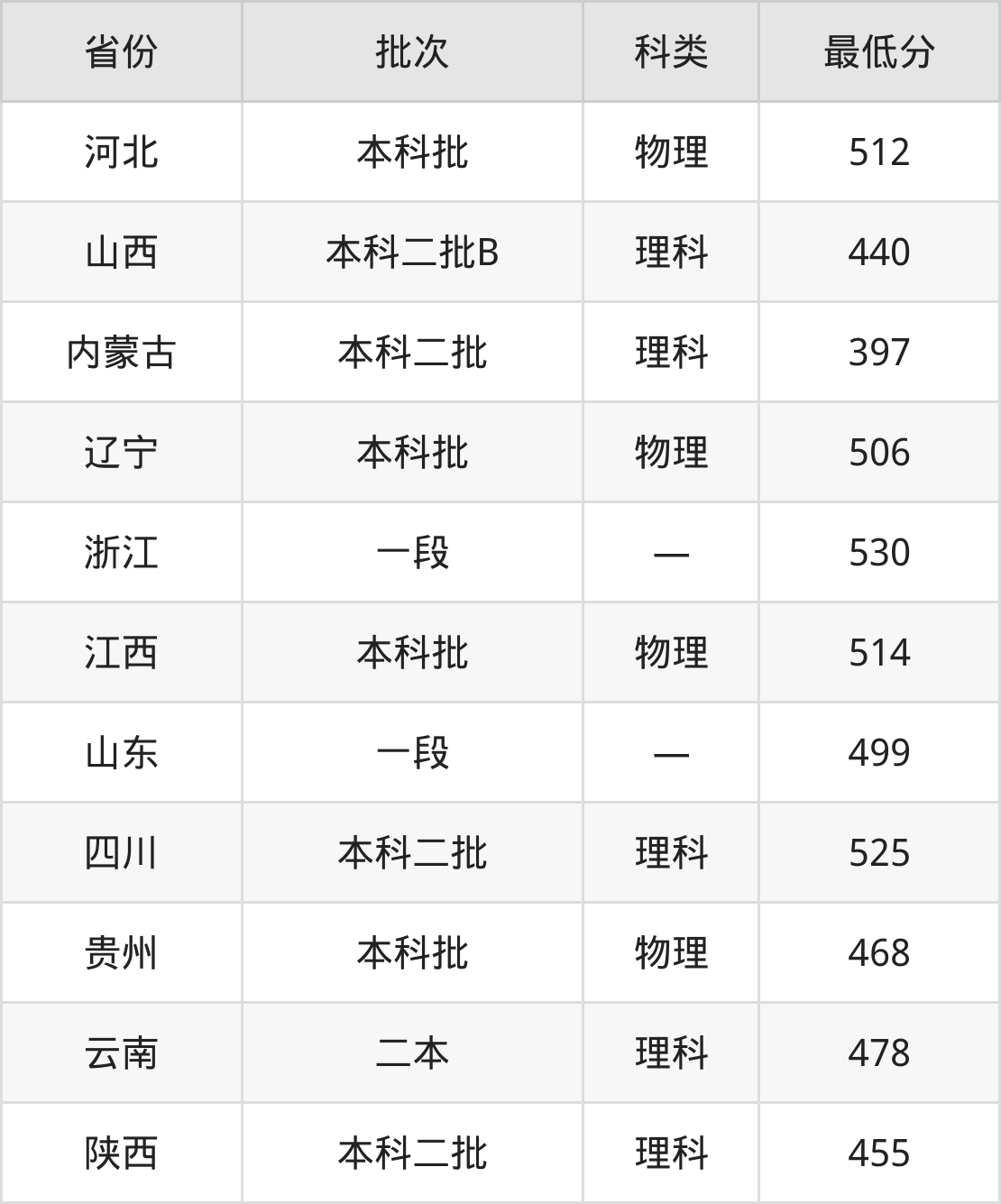 防灾科技学院城市地下空间工程专业在全国各省最低录取分数线为397分(内蒙古理科),除此之外,在其余地区的最低分为四川理科525分、贵州物理类468分、云南理科478分、河北物理类512分等,以上数据均为2024年数据,供2025年高考生参考。