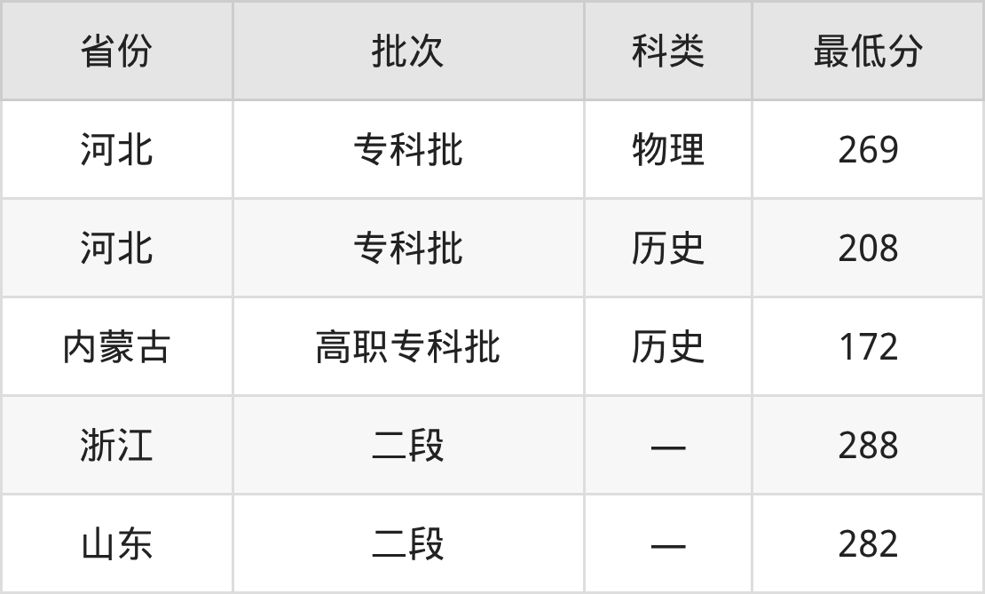 兰州外语职业学院计算机应用技术专业在全国各省最低录取分数线为172分(内蒙古历史类),除此之外,在其余地区的最低分为河北历史类208分、浙江288分、山东282分,以上数据均为2025年数据,供2026年高考生参考。