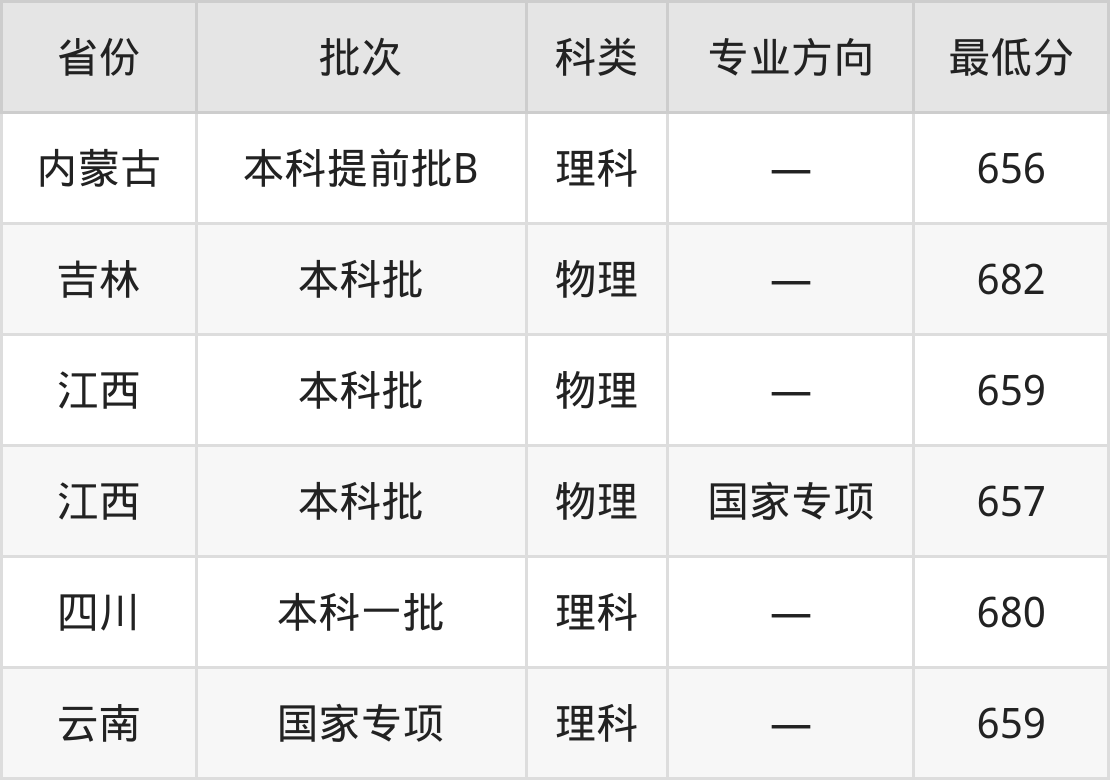 中国科学技术大学核工程类专业录取分数线从656分到682分不等,最低分数线如下:
