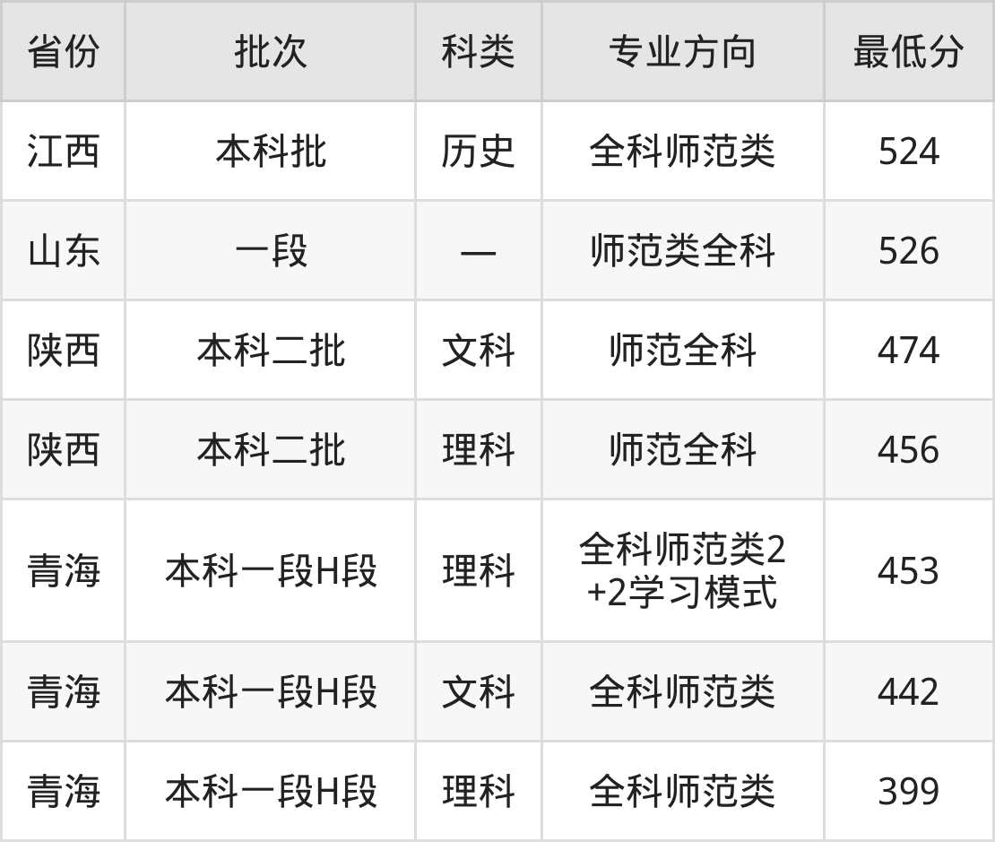 青海师范大学小学教育专业录取分数线从399分到526分不等,最低分数线如下:
