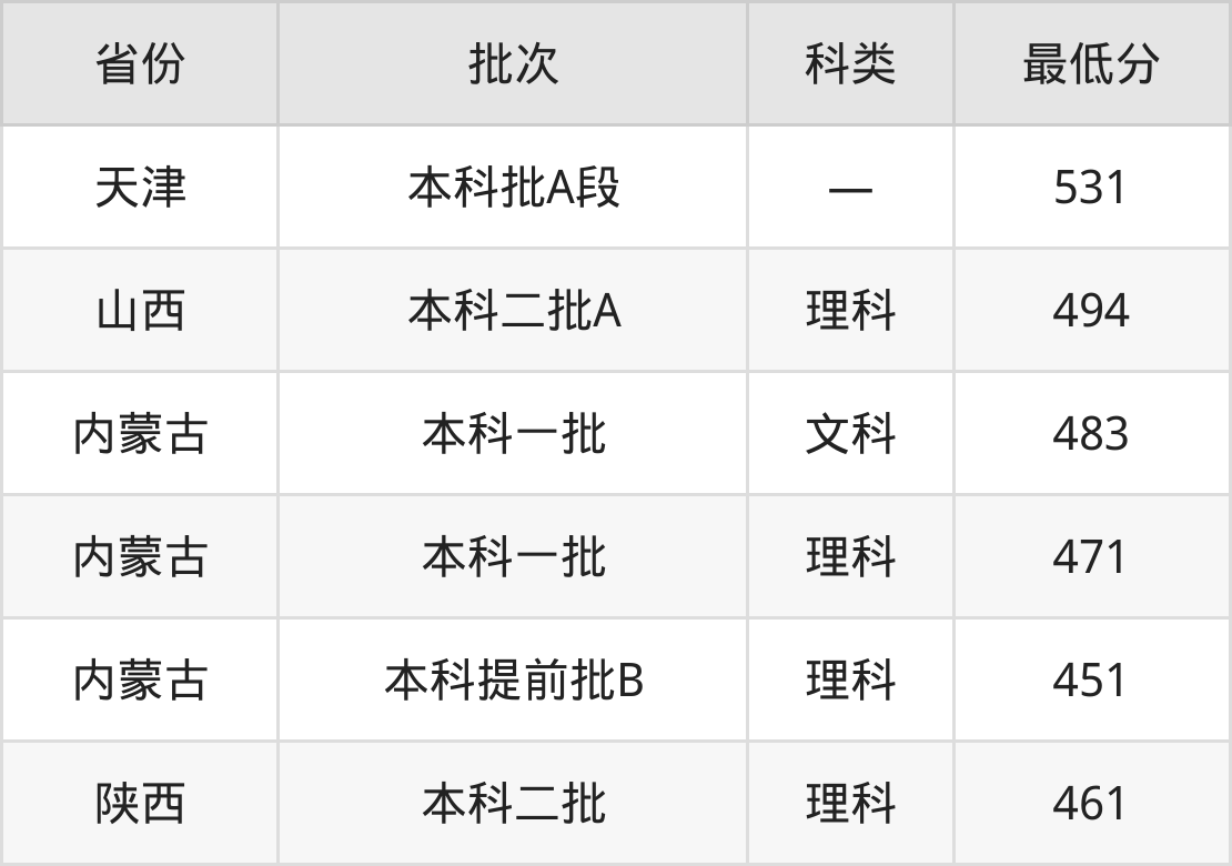 内蒙古农业大学农林经济管理专业在全国各省最低录取分数线为451分(内蒙古理科),除此之外,在其余地区的最低分为天津531分、山西理科494分、陕西理科461分,以上数据均为2024年数据,供2025年高考生参考。