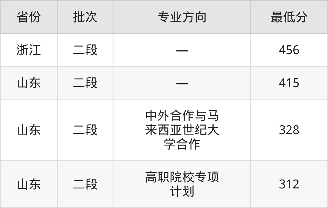 东营职业学院机械制造及自动化专业录取分数线从312分到456分不等,最低分数线如下: