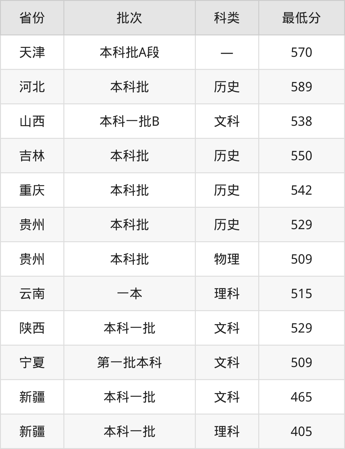 天津财经大学广播电视学专业在全国各省最低录取分数线为405分(新疆理科),除此之外,在其余地区的最低分为吉林历史类550分、重庆历史类542分、云南理科515分、陕西文科529分等,以上数据均为2024年数据,供2025年高考生参考。