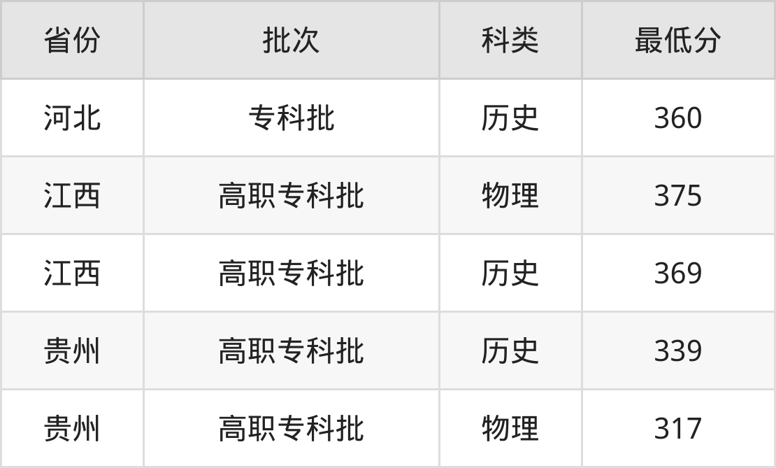 江西机电职业技术学院计算机应用技术专业录取分数线从317分到375分不等,最低分数线如下: