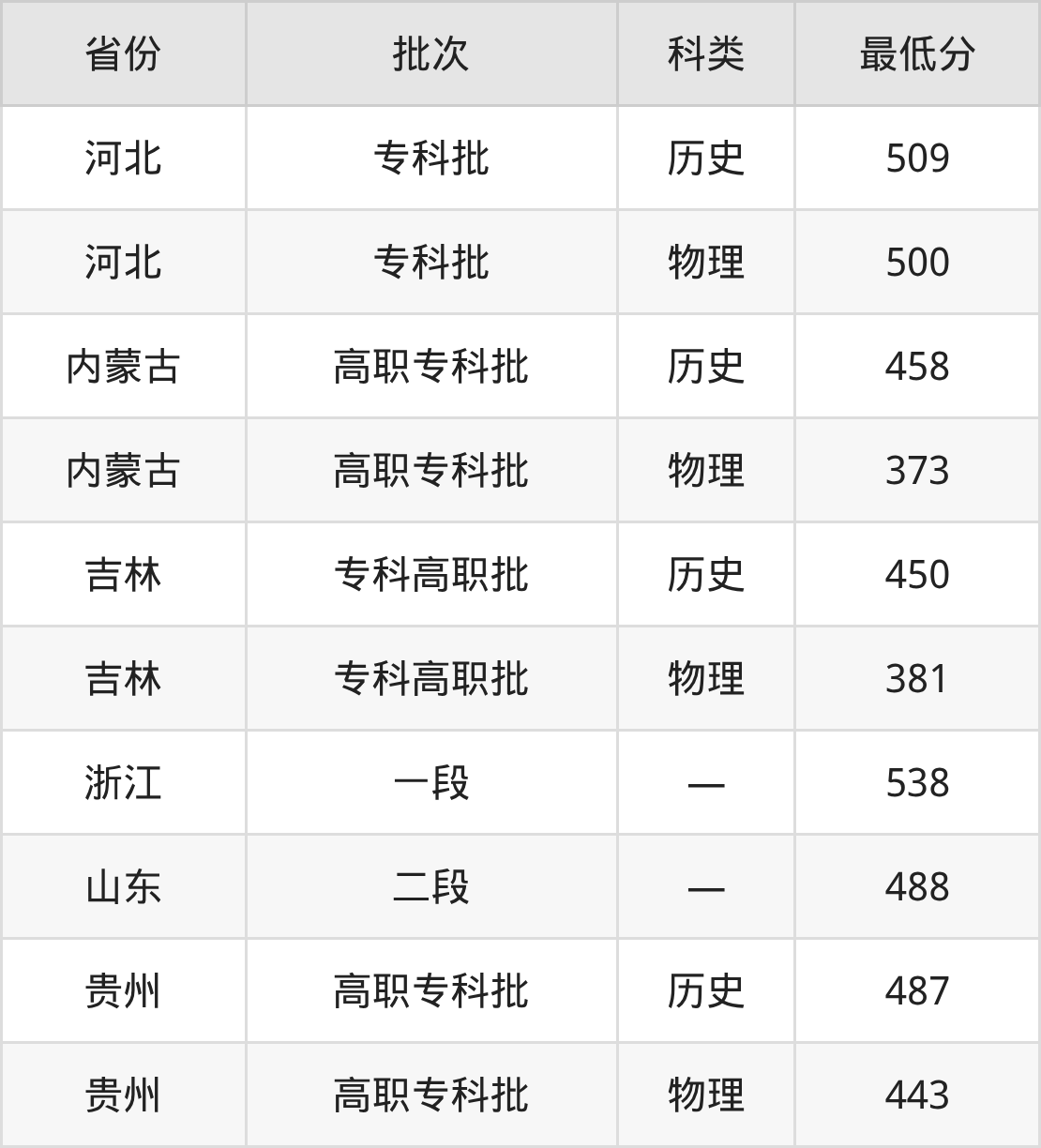 武汉铁路职业技术学院铁道交通运营管理专业在全国各省最低录取分数线为373分(内蒙古物理类),除此之外,在其余地区的最低分为浙江538分、山东488分、贵州物理类443分、河北物理类500分等,以上数据均为2025年数据,供2026年高考生参考。