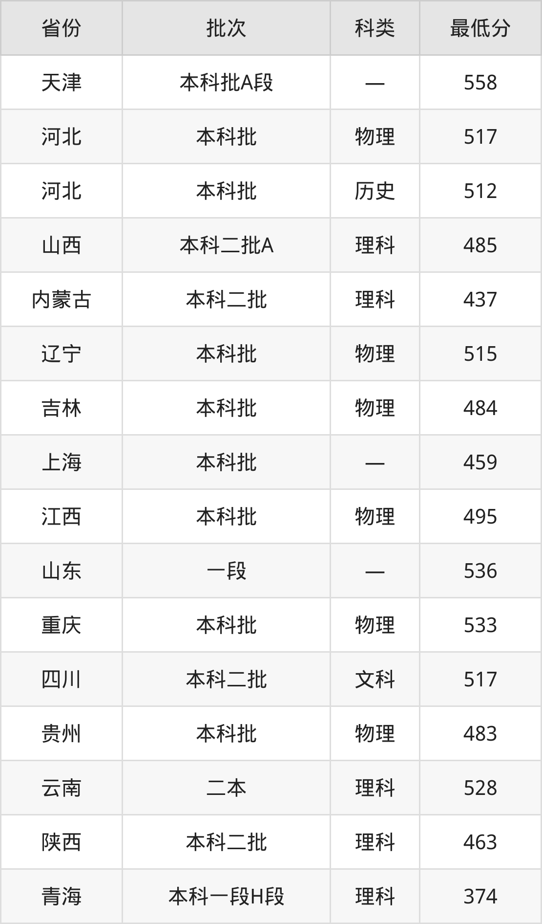 承德医学院护理学专业录取分数线从374分到558分不等,在部分地区的最低分数线如下: