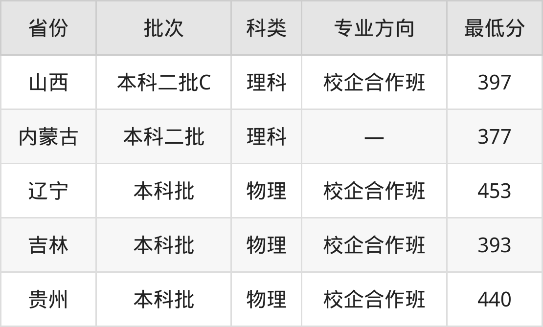 北京城市学院物联网工程专业录取分数线从377分到453分不等,最低分数线如下: