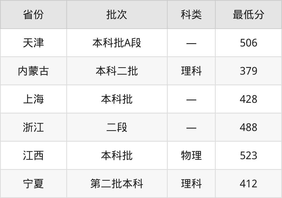 湖南工学院环境工程专业在全国各省最低录取分数线为379分(内蒙古理科),除此之外,在其余地区的最低分为天津506分、上海428分、浙江488分、江西物理类523分等,以上数据均为2024年数据,供2025年高考生参考。