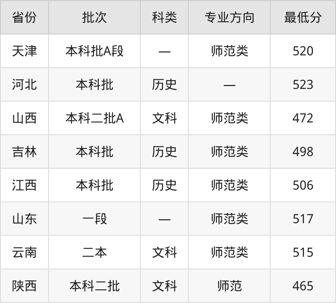 吕梁学院思想政治教育专业在全国各省最低录取分数线为465分(陕西文科),除此之外,在其余地区的最低分为河北历史类523分、山西文科472分、吉林历史类498分、江西历史类506分等,以上数据均为2024年数据,供2025年高考生参考。