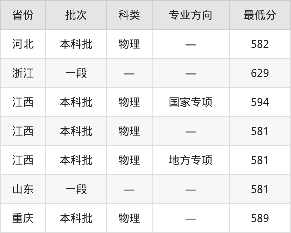 南昌大学基础医学专业在全国各省最低录取分数线为581分(江西物理类),除此之外,在其余地区的最低分为重庆物理类589分、河北物理类582分、浙江629分、山东581分,以上数据均为2024年数据,供2025年高考生参考。