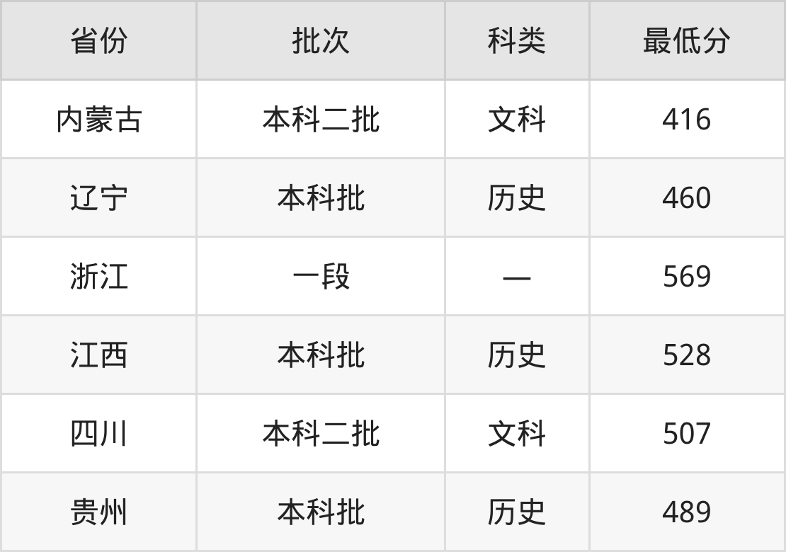 湖南文理学院市场营销专业在全国各省最低录取分数线为416分(内蒙古文科),除此之外,在其余地区的最低分为辽宁历史类460分、浙江569分、江西历史类528分、四川文科507分等,以上数据均为2024年数据,供2025年高考生参考。