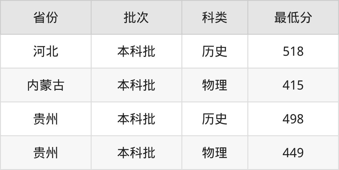湖北工程学院新技术学院财务管理专业在全国各省最低录取分数线为415分(内蒙古物理类),除此之外,在其余地区的最低分为贵州物理类449分、河北历史类518分,以上数据均为2025年数据,供2026年高考生参考。