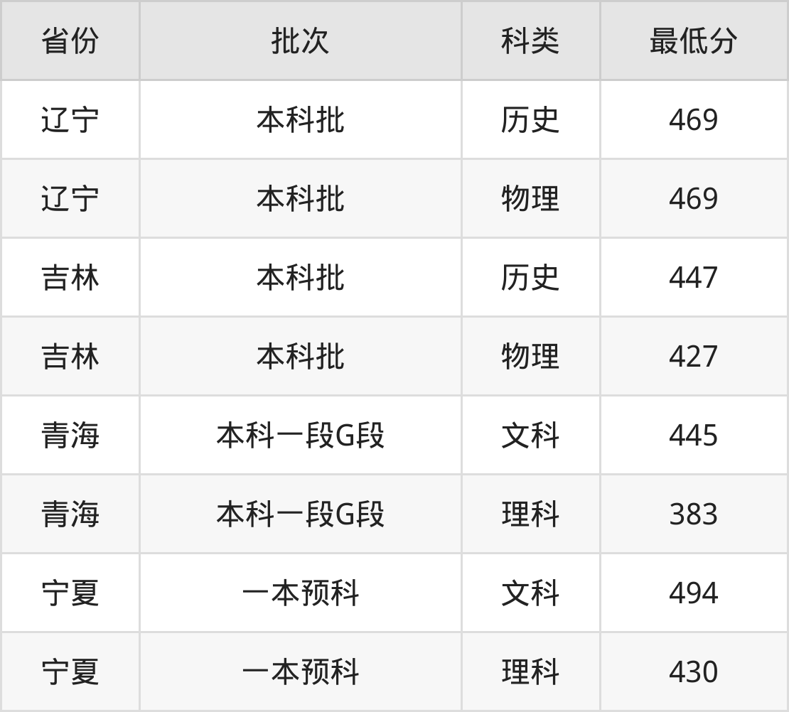 北方民族大学本科预科班专业录取分数线从383分到494分不等,最低分数线如下: