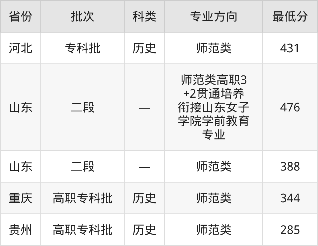 济南幼儿师范高等专科学校学前教育专业录取分数线从285分到476分不等,最低分数线如下: