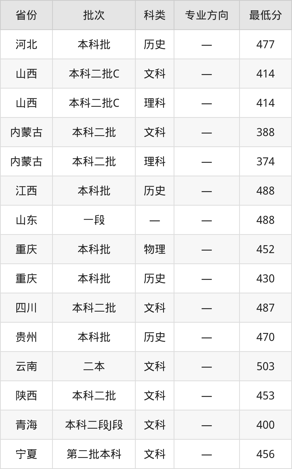 重庆移通学院外国语言文学类专业录取分数线从374分到503分不等,在部分地区的最低分数线如下: