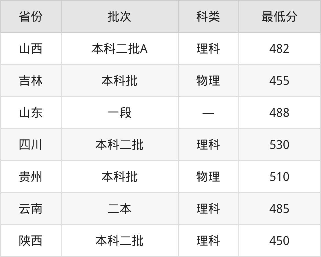 西南林业大学消防工程专业在全国各省最低录取分数线为450分(陕西理科),除此之外,在其余地区的最低分为吉林物理类455分、山东488分、四川理科530分、贵州物理类510分等,以上数据均为2024年数据,供2025年高考生参考。