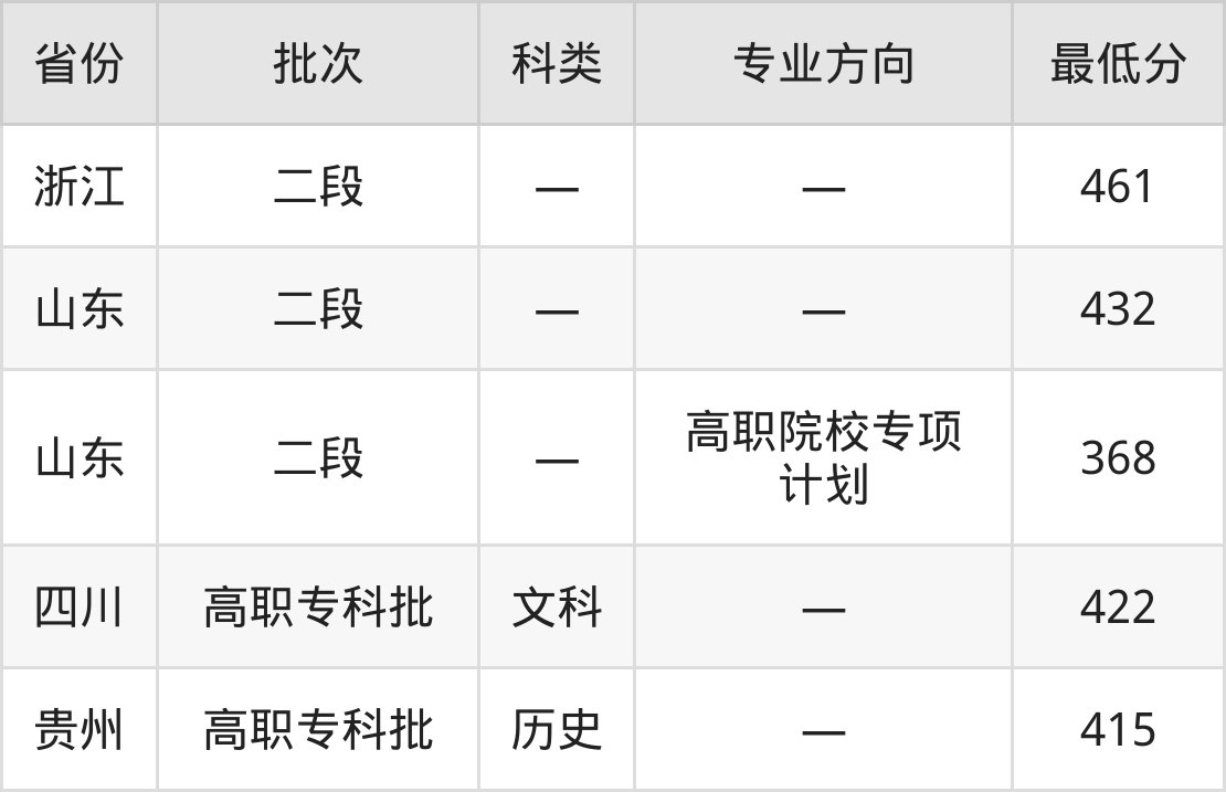 日照职业技术学院食品生物技术专业在全国各省最低录取分数线为368分(山东),除此之外,在其余地区的最低分为四川文科422分、贵州历史类415分、浙江461分,以上数据均为2024年数据,供2025年高考生参考。