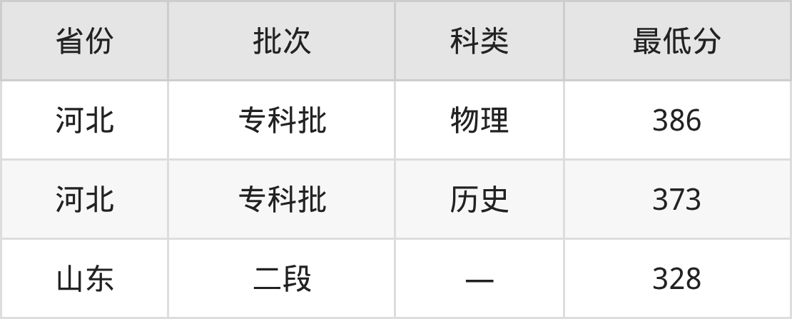 石家庄科技信息职业学院城市轨道交通运营管理专业录取分数线从328分到386分不等,最低分数线如下: