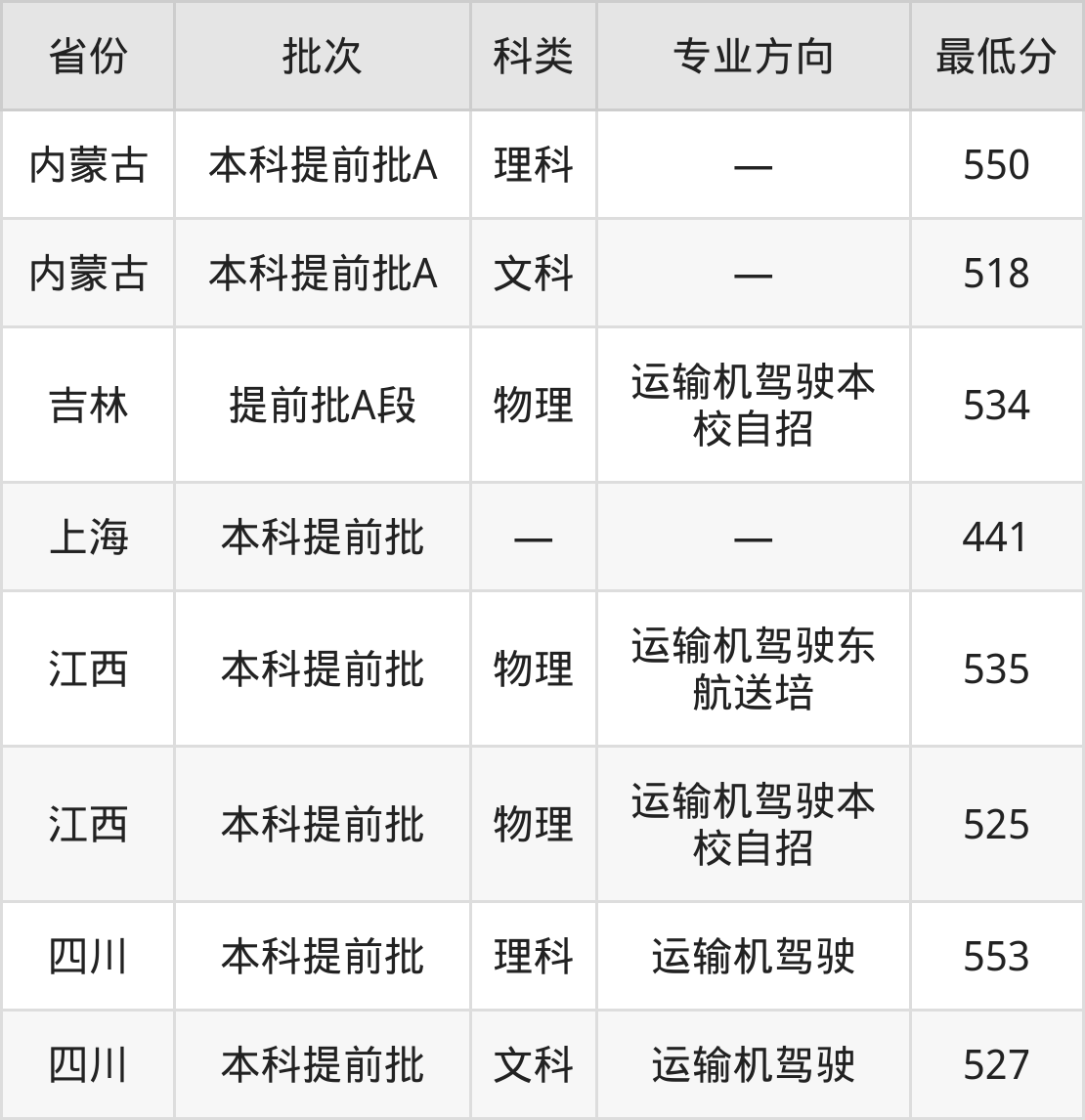 中国民用航空飞行学院飞行技术专业录取分数线从441分到553分不等,最低分数线如下: