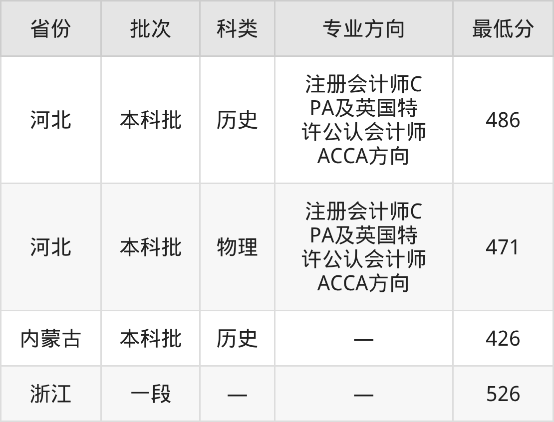 上海立达学院财务管理专业在全国各省最低录取分数线为426分(内蒙古历史类),除此之外,在其余地区的最低分为河北物理类471分、浙江526分,以上数据均为2025年数据,供2026年高考生参考。