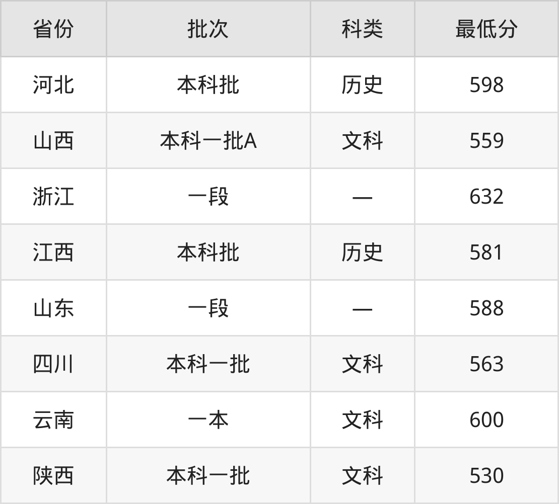 湘潭大学中国共产党历史专业在全国各省最低录取分数线为530分(陕西文科),除此之外,在其余地区的最低分为山西文科559分、浙江632分、江西历史类581分、山东588分等,以上数据均为2024年数据,供2025年高考生参考。