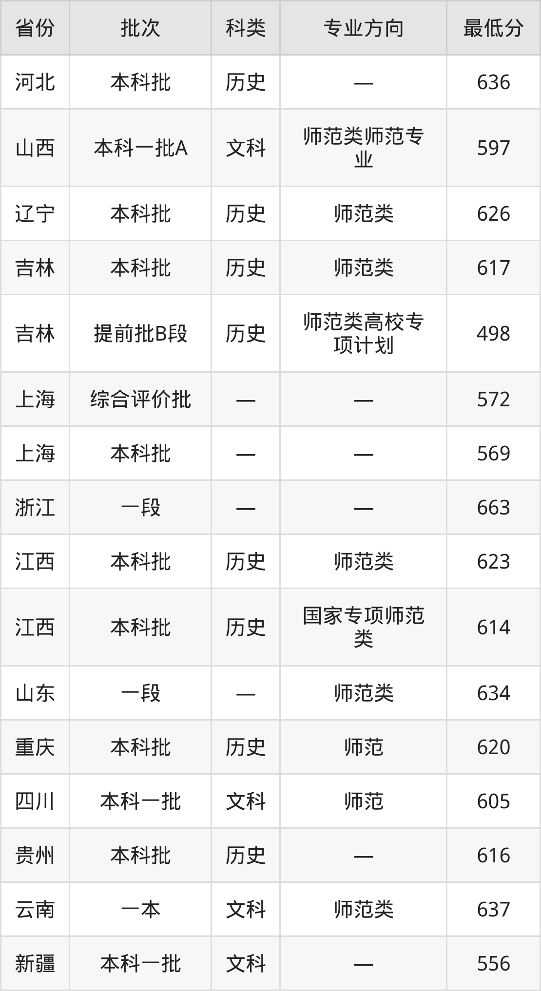 华东师范大学教育学类专业录取分数线从498分到663分不等,在部分地区的最低分数线如下:
