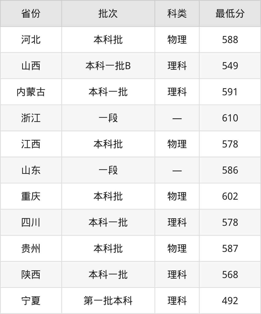 南华大学临床医学专业录取分数线从492分到610分不等,在部分地区的最低分数线如下: