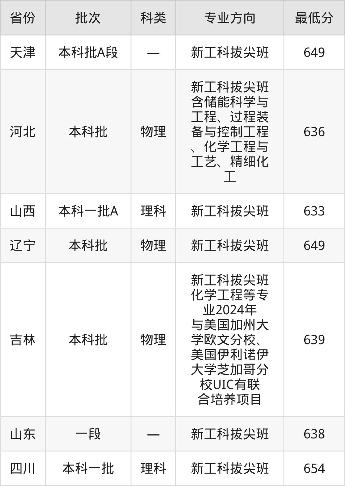 大连理工大学储能科学与工程专业在全国各省录取分数线: