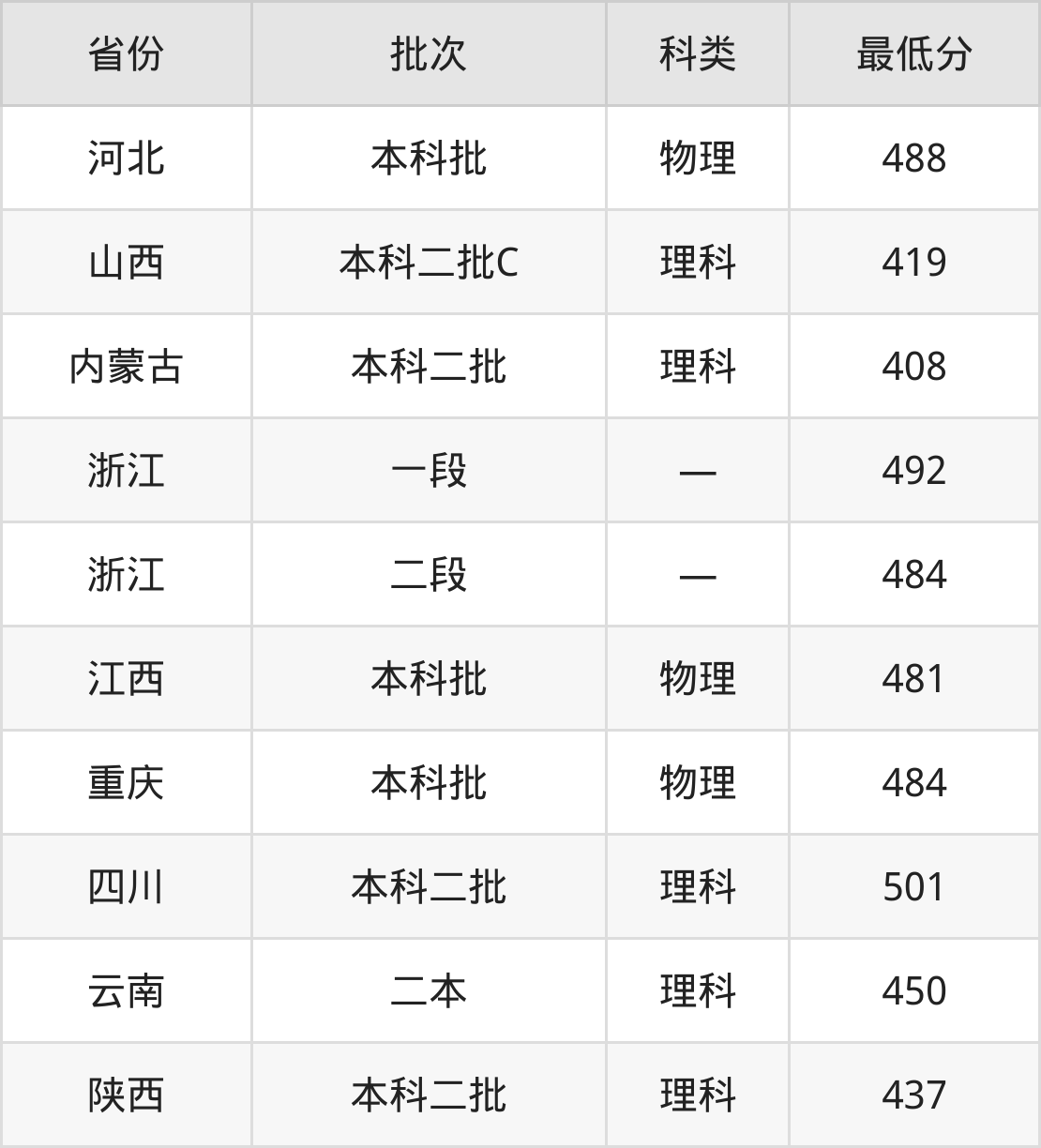 重庆人文科技学院计算机科学与技术专业在全国各省最低录取分数线为408分(内蒙古理科),除此之外,在其余地区的最低分为云南理科450分、山西理科419分、江西物理类481分、浙江484分等,以上数据均为2024年数据,供2025年高考生参考。