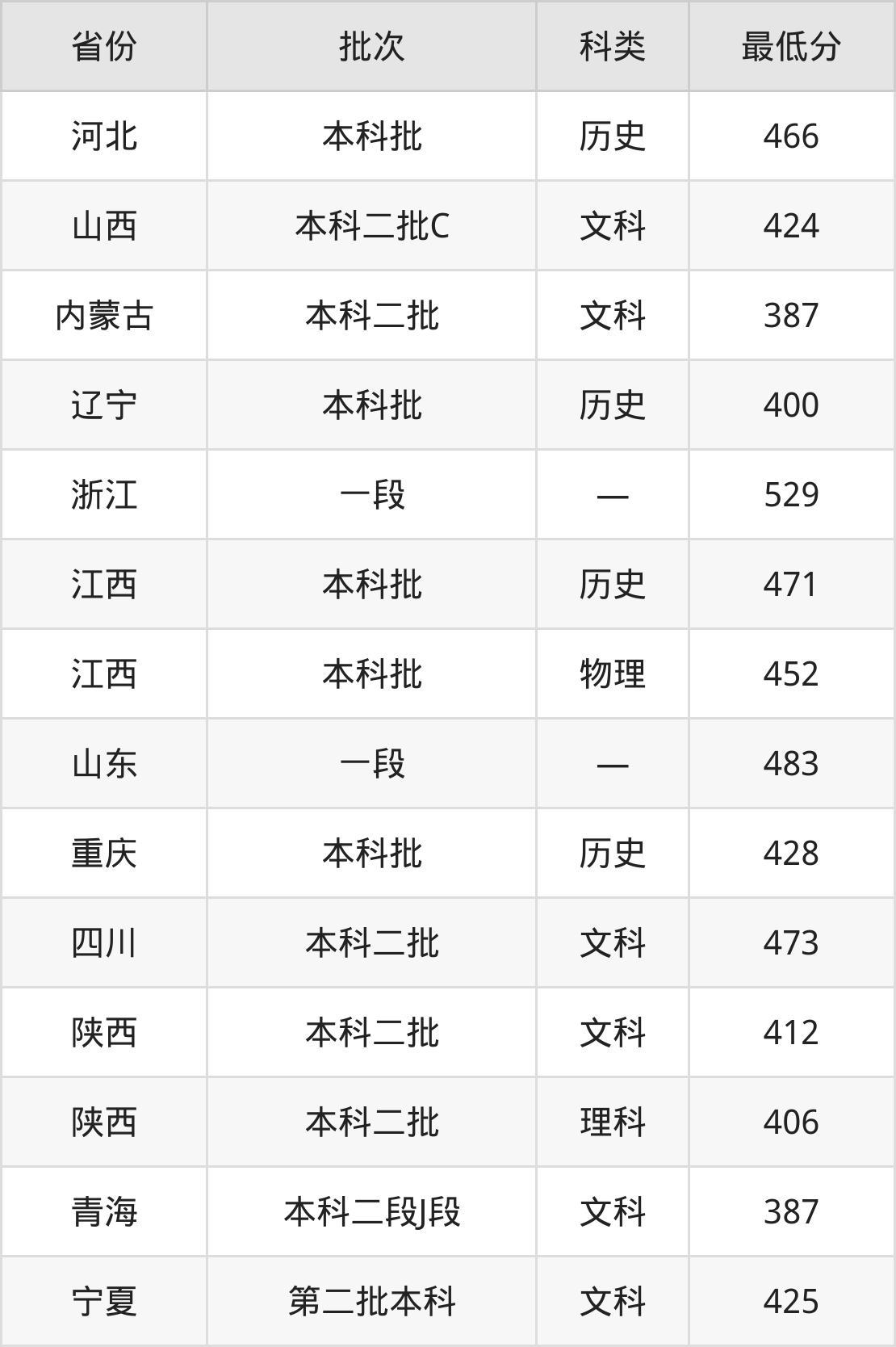 西安明德理工学院英语专业录取分数线从387分到529分不等,在部分地区的最低分数线如下: