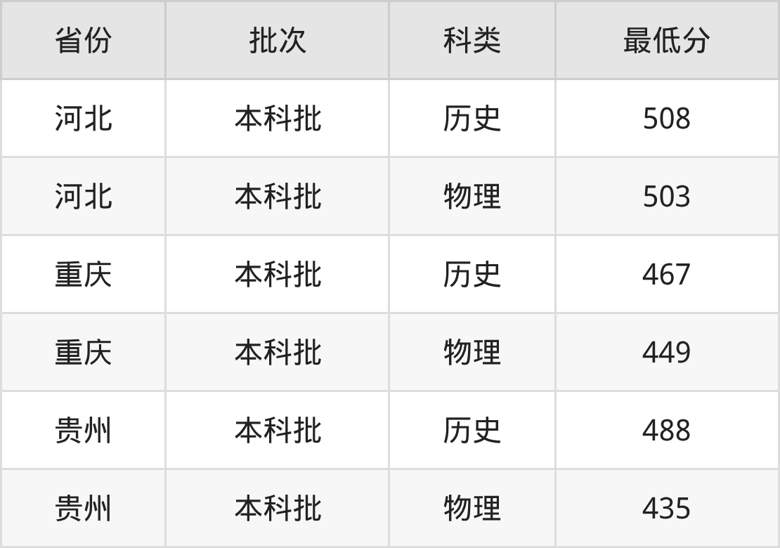 重庆外语外事学院财务会计教育专业在全国各省最低录取分数线为435分(贵州物理类),除此之外,在其余地区的最低分为河北物理类503分、重庆物理类449分,以上数据均为2025年数据,供2026年高考生参考。